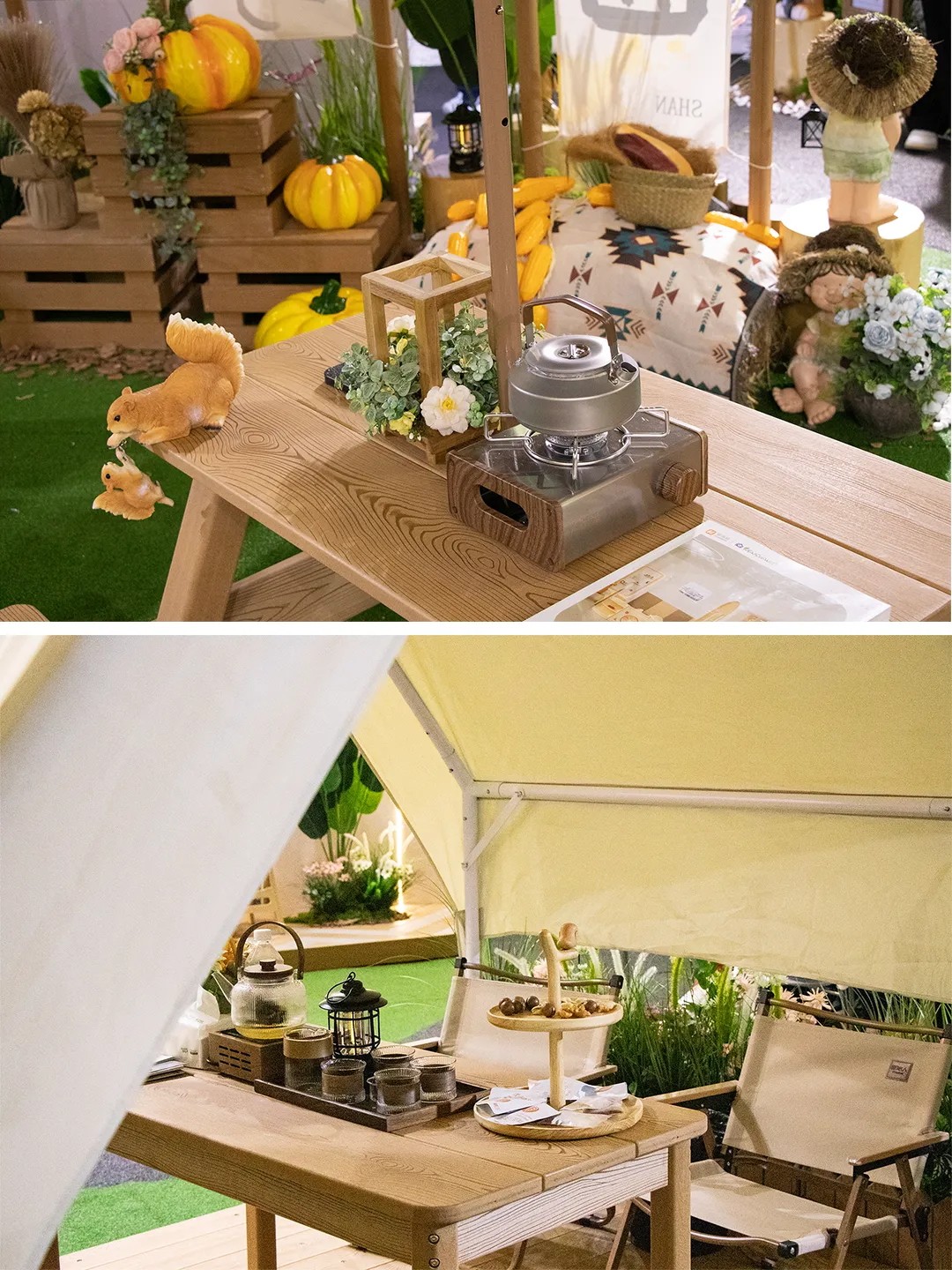 戶外休閑區域的桌椅、帳篷,營造了輕松、舒適、貼近自然的露營氛圍。桌面紋理自然,手感細膩。